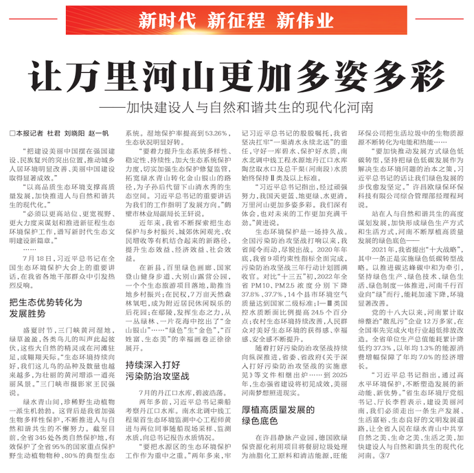 7月18日,习近平总书记在全国生态环境保护大会上的重要讲话,在我省各地干部群众中引发热烈反响。(今日《河南日报》2版)