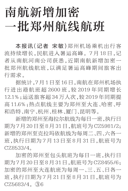 郑州机场乘机出行客流持续增长,民航进入暑运高峰。7月18日,记者从南航河南公司获悉,近期南航新增加密一批郑州航线航班,以满足暑运高峰期间旅客出行需求。(今日《河南日报》4版)