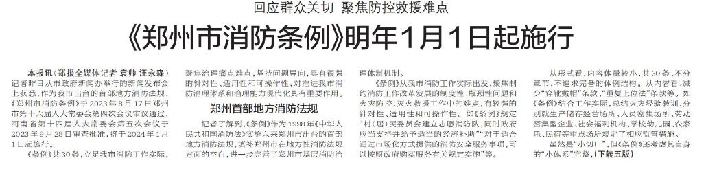 《郑州市消防条例》将于明年1月1日起施行