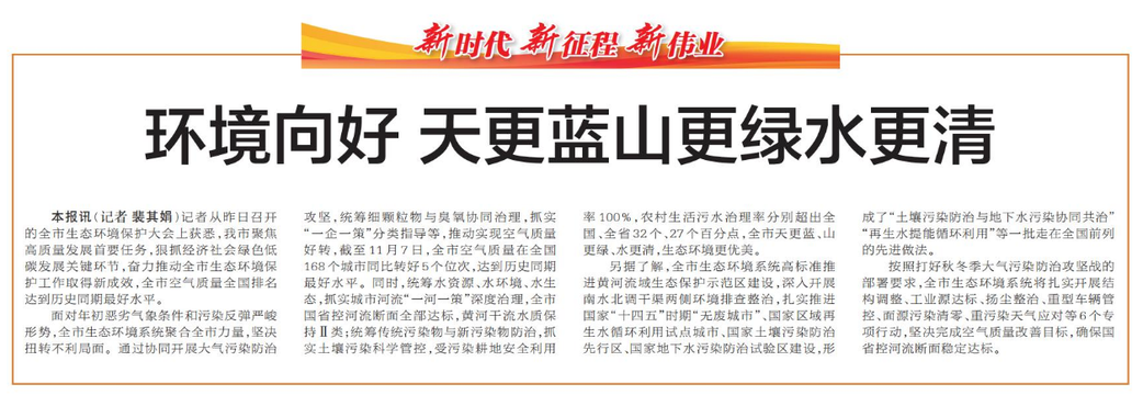 记者从昨日召开的全市生态环境保护大会上获悉,我市聚焦高质量发展首要任务,狠抓经济社会绿色低碳发展关键环节,奋力推动全市生态环境保护工作取得新成效,全市空气质量全国排名达到历史同期最好水平。(今日《郑州日报》2版)