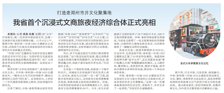 把“火车”开进街区,能一边欣赏中原民俗文化,还能一边体验开放式街区购物乐趣。11月9日上午,随着中铁·泰和里—印巷1923主题街区正式开街,河南首个沉浸式文商旅夜经济综合体在郑州火车站商圈正式亮相。(今日《郑州日报》2版)