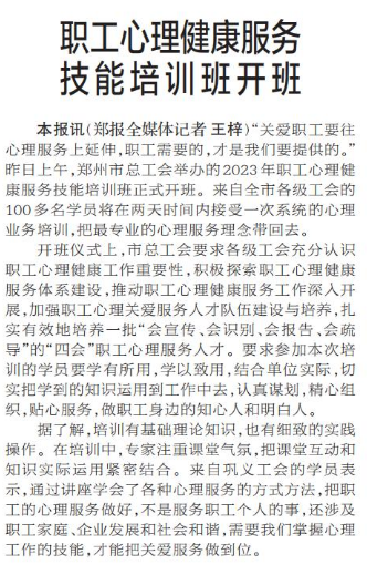 “关爱职工要往心理服务上延伸,职工需要的,才是我们要提供的。”昨日上午,郑州市总工会举办的2023年职工心理健康服务技能培训班正式开班。来自全市各级工会的100多名学员将在两天时间内接受一次系统的心理业务培训,把最专业的心理服务理念带回去。(今日《郑州日报》2版)