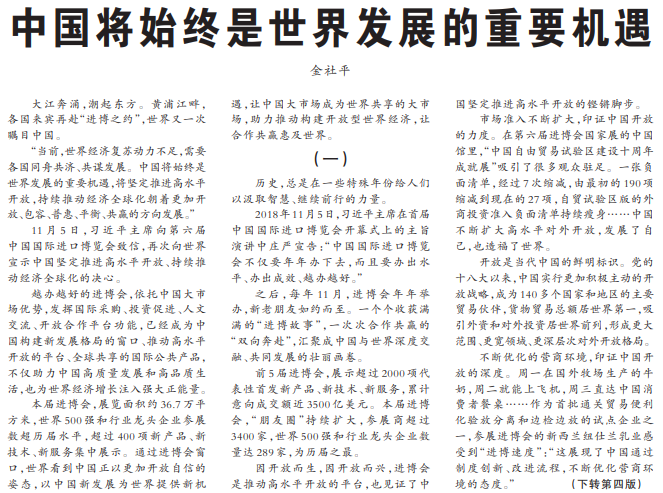 “当前,世界经济复苏动力不足,需要各国同舟共济、共谋发展。中国将始终是世界发展的重要机遇,将坚定推进高水平开放,持续推动经济全球化朝着更加开放、包容、普惠、平衡、共赢的方向发展。”(今日《人民日报》1版、4版)