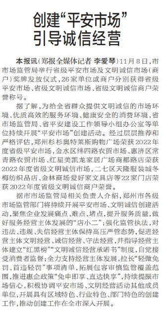 11月8日,市市场监管局举行省级平安市场及文明诚信市场(商户)奖牌发放仪式,26家单位或商户分别获得省级平安市场、省级文明诚信市场、省级文明诚信商户荣誉称号。(今日《郑州日报》2版)