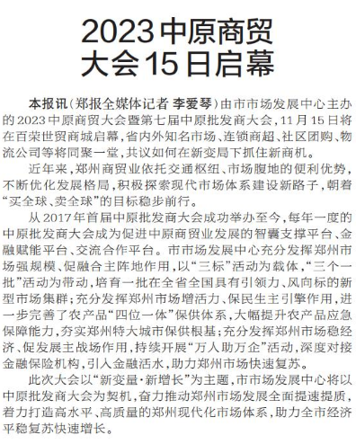 由市市场发展中心主办的2023中原商贸大会暨第七届中原批发商大会,11月15日将在百荣世贸商城启幕,省内外知名市场、连锁商超、社区团购、物流公司等将同聚一堂,共议如何在新变局下抓住新商机。(今日《郑州日报》2版)