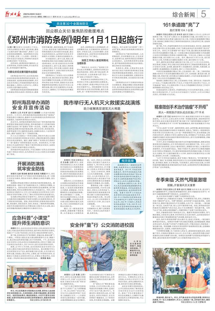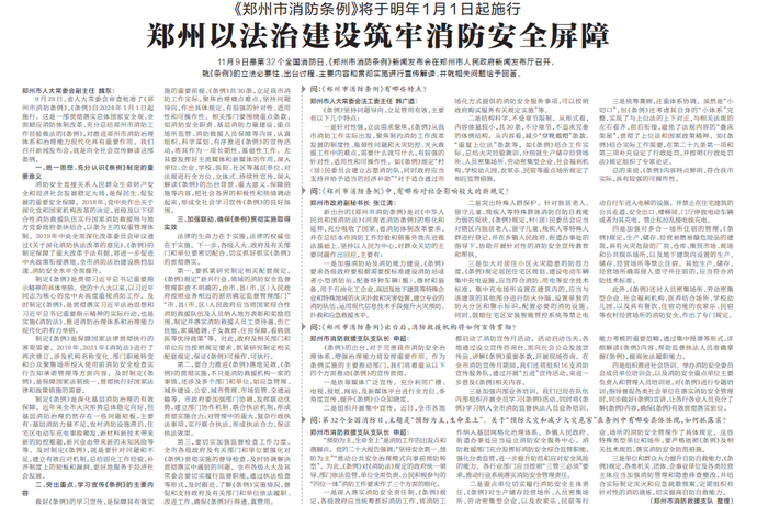 11月9日是第32个全国消防日,《郑州市消防条例》新闻发布会在郑州市人民政府新闻发布厅召开,就《条例》的立法必要性、出台过程、主要内容和贯彻实施进行宣传解读,并就相关问题给予回答。(今日《河南日报》7版)