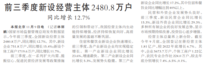 前三季度新设经营主体2480.8万户