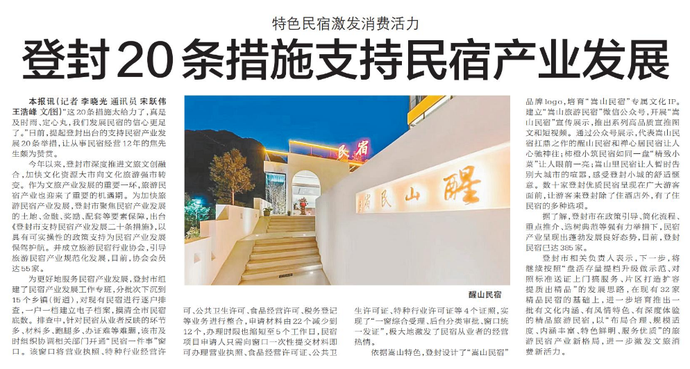 “这20条措施太给力了,真是及时雨、定心丸,我们发展民宿的信心更足了。”日前,提起登封出台的支持民宿产业发展20条举措,让从事民宿经营12年的焦先生颇为赞赏。(今日《郑州日报》7版)
