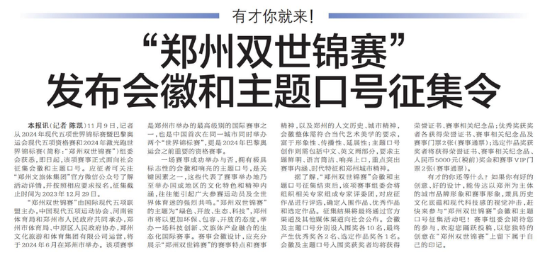 11月9日,记者从2024年现代五项世界锦标赛暨巴黎奥运会现代五项资格赛和2024年激光跑世界锦标赛(简称:“郑州双世锦赛”)组委会获悉,即日起,该项赛事正式面向社会征集会徽和主题口号。应征者可关注“郑州文旅体集团”官方微信公众号了解活动详情,并按照相应要求报名,征集截止时间为2023年12月29日。(今日《郑州日报》8版)