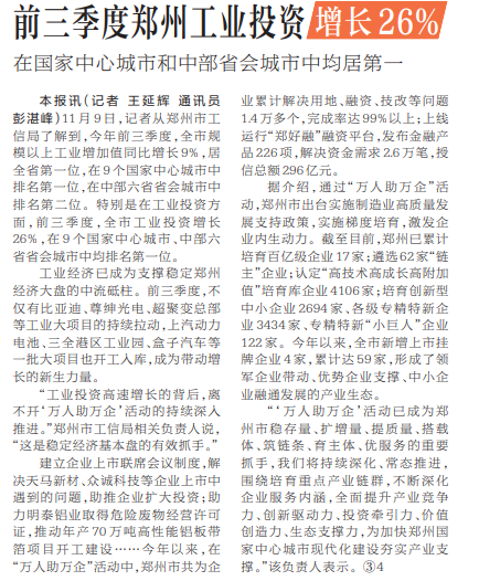 前三季度郑州工业投资增长26%