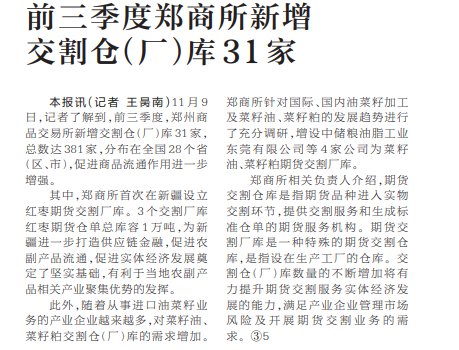 11月9日,记者了解到,前三季度,郑州商品交易所新增交割仓(厂)库31家,总数达381家,分布在全国28个省(区、市),促进商品流通作用进一步增强。(今日《河南日报》2版)