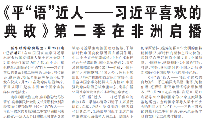 在中国国家主席习近平出席金砖国家领导人第十五次会晤并对南非进行国事访问之际,由中央广播电视总台制作的《平“语”近人——习近平喜欢的典故》第二季英语、法语、阿拉伯语、豪萨语、斯瓦希里语等多语种版本发布仪式8月20日在约翰内斯堡举行。节目从即日起在非洲38个国家主流媒体落地播出。(今日《人民日报》1版)