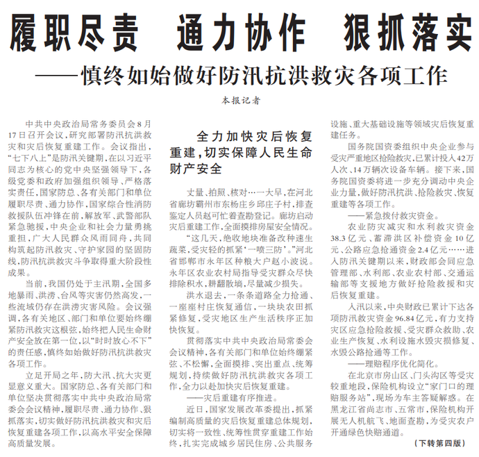 中共中央政治局常务委员会8月17日召开会议,研究部署防汛抗洪救灾和灾后恢复重建工作。会议指出,“七下八上”是防汛关键期,在以习近平同志为核心的党中央坚强领导下,各级党委和政府加强组织领导、严格落实责任,国家防总、各有关部门和单位履职尽责、通力协作,国家综合性消防救援队伍冲锋在前,解放军、武警部队紧急驰援,中央企业和社会力量勇挑重担,广大人民群众风雨同舟,共同构筑起防汛救灾、守护家园的坚固防线,防汛抗洪救灾斗争取得重大阶段性成果。(今日《人民日报》1版、4版)