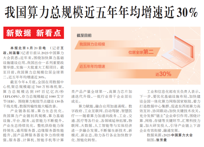 记者日前从2023中国算力大会获悉:近年来,围绕加快算力基础设施建设应用,我国出台一系列重要政策举措,实施一大批重大工程项目。截至目前,我国算力总规模位居全球第二,近五年年均增速近30%。(今日《人民日报》1版)
