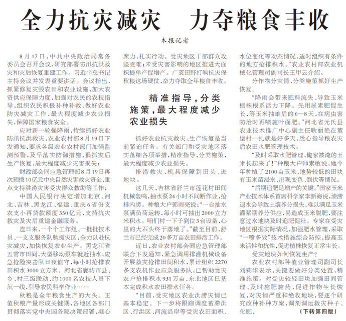 8月17日,中共中央政治局常务委员会召开会议,研究部署防汛抗洪救灾和灾后恢复重建工作。习近平总书记主持会议并发表重要讲话。会议指出,抓紧修复灾毁农田和农业设施,加大农资供应保障力度,加强对农民的农技指导,组织农民积极补种补救,做好农业防灾减灾工作,最大程度减少农业损失,保障国家粮食安全。(今日《人民日报》1版、4版)