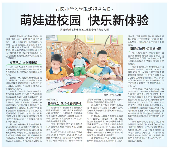 观看精彩的无人机表演,敲响神秘的非洲鼓,画一幅脑洞大开的“国画”……昨日是郑州市区小学现场报名的第一天,走进校园的孩子们玩得不亦乐乎。据了解,8月20日、21日是郑州市区小学入学现场报名的时间,线上报名不成功或者线上报名审核未通过,以及未进行线上报名的适龄儿童,需要进行现场报名。(今日《郑州日报》6版)