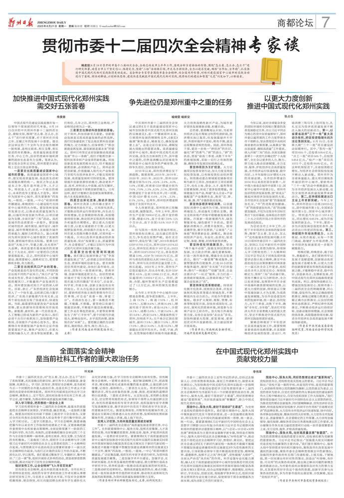 “全会站位高远、目标明确、路径清晰,既客观分析形势任务,明确奋斗目标,又有针对性地部署下半年经济工作及重点任务,既讲清了怎么看,又具体指出干什么、怎么干,必将指导和推动广大干部群众坚定信心、保持清醒、更加奋发有为地推动郑州高质量发展。”管城区委书记张艳敏在接受本报专访时说。管城区将全面深入贯彻落实全会精神,只争朝夕、攻坚克难、真抓实干,奋力冲刺“全年红”“全年稳”,为郑州国家中心城市现代化建设作出更大贡献。(今日《郑州日报》2版)