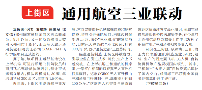 郑州国家通航示范区再添新成员。8月17日,又一优质通航项目被引入郑州市上街区,山西圣大致远通用航空有限责任公司CCAR-141飞行学院项目正式签约。(今日《河南日报》1版、4版)