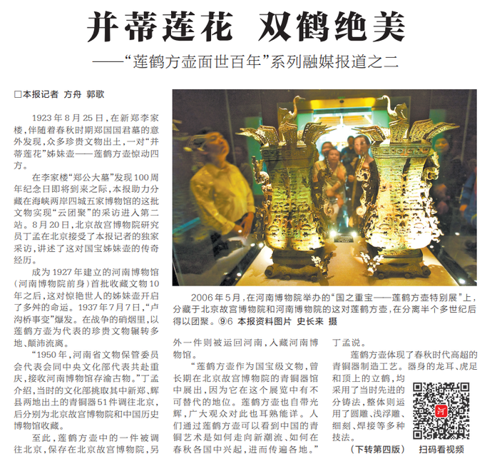 1923年8月25日,在新郑李家楼,伴随着春秋时期郑国国君墓的意外发现,众多珍贵文物出土,一对“并蒂莲花”姊妹壶——莲鹤方壶惊动四方。(今日《河南日报》1版、4版)