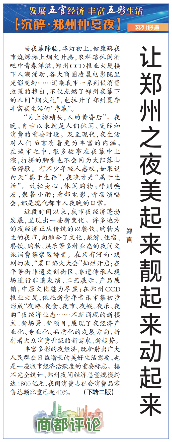 当夜幕降临,华灯初上,健康路夜市烧烤摊上烟火升腾,农科路休闲酒吧中青春洋溢,郑州CCD报业大厦楼下人潮涌动,各大商圈凌晨电影院里光影变幻……近期我市一系列促消费政策的推出,不仅点燃了郑州夜幕下的人间“烟火气”,也拉开了郑州夏季丰富夜生活的“序幕”。(今日《郑州日报》1版、2版)