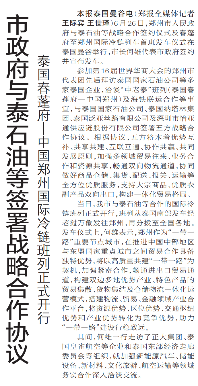 6月26日,郑州市人民政府与泰石油等战略合作签约仪式及春蓬府至郑州国际冷链列车首班发车仪式在泰国曼谷举行,市长何雄代表市政府签约并宣布发车。(今日《郑州日报》1版)