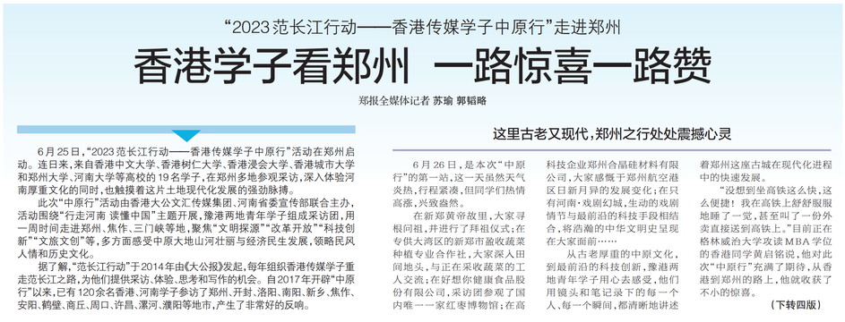 6月25日,“2023范长江行动——香港传媒学子中原行”活动在郑州启动。连日来,来自香港中文大学、香港树仁大学、香港浸会大学、香港城市大学和郑州大学、河南大学等高校的19名学子,在郑州多地参观采访,深入体验河南厚重文化的同时,也触摸着这片土地现代化发展的强劲脉搏。(今日《郑州日报》1版、4版)