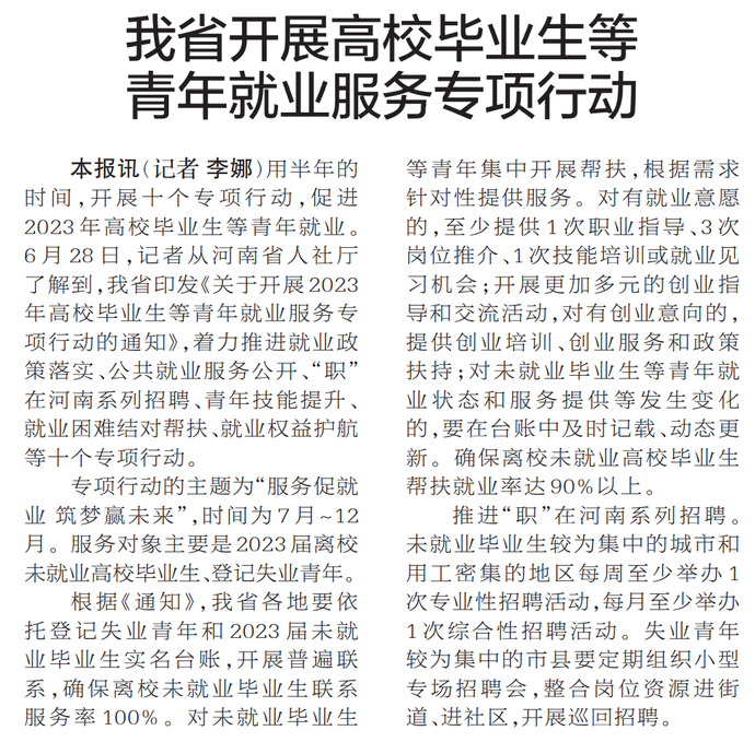 用半年的时间,开展十个专项行动,促进2023年高校毕业生等青年就业。6月28日,记者从河南省人社厅了解到,我省印发《关于开展2023年高校毕业生等青年就业服务专项行动的通知》,着力推进就业政策落实、公共就业服务公开、“职”在河南系列招聘、青年技能提升、就业困难结对帮扶、就业权益护航等十个专项行动。(今日《郑州日报》2版)