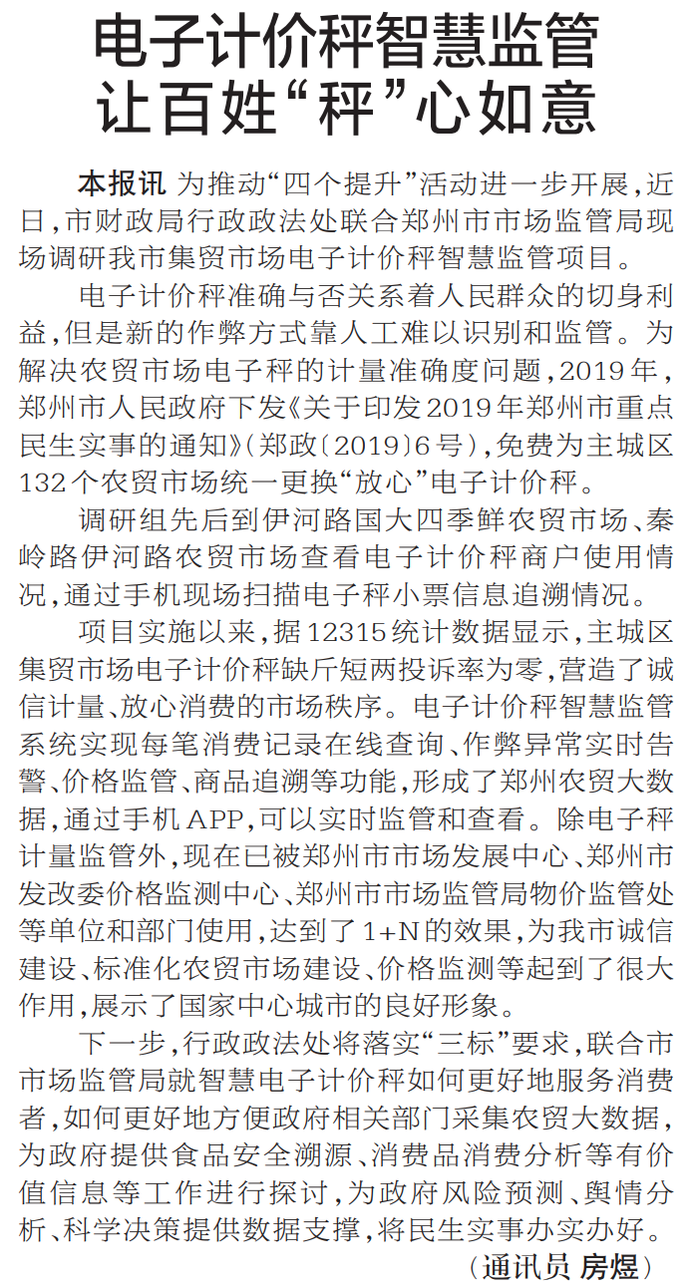 为推动“四个提升”活动进一步开展,近日,市财政局行政政法处联合郑州市市场监管局现场调研我市集贸市场电子计价秤智慧监管项目。(今日《郑州日报》2版)
