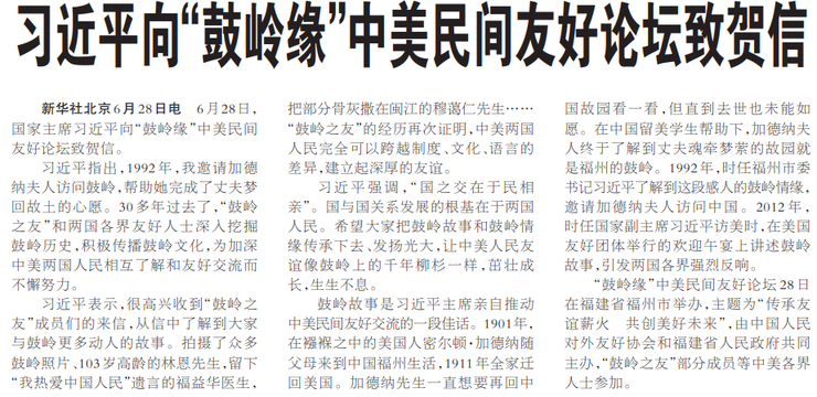 6月28日,国家主席习近平向“鼓岭缘”中美民间友好论坛致贺信。