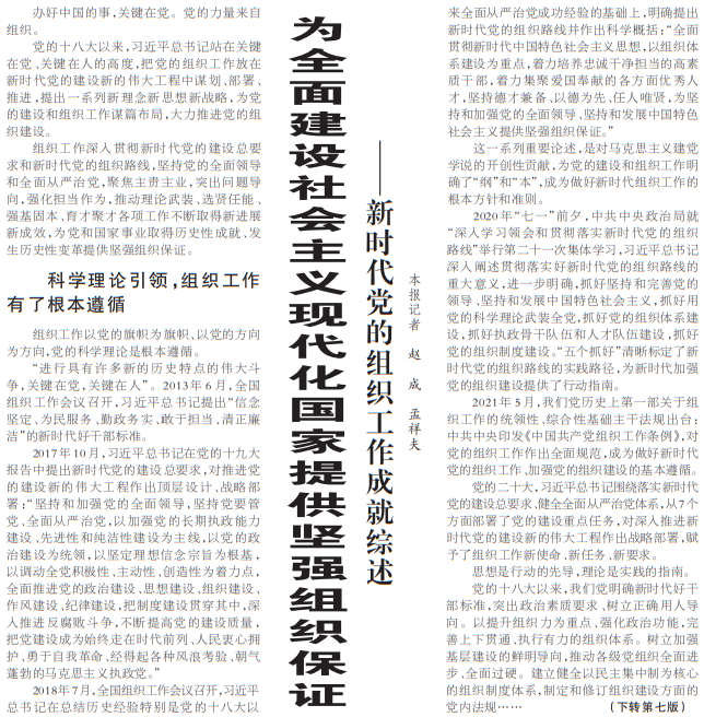 组织工作深入贯彻新时代党的建设总要求和新时代党的组织路线,坚持党的全面领导和全面从严治党,聚焦主责主业,突出问题导向,强化担当作为,推动理论武装、选贤任能、强基固本、育才聚才各项工作不断取得新进展新成效,为党和国家事业取得历史性成就、发生历史性变革提供坚强组织保证。(今日《人民日报》1版、7版)