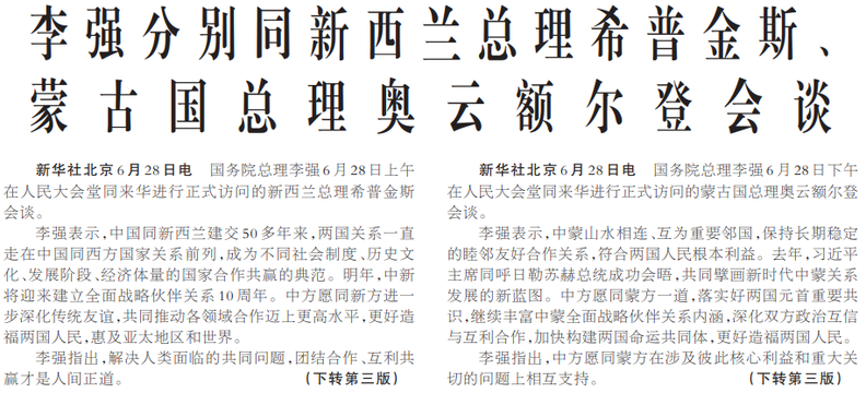 国务院总理李强6月28日上午在人民大会堂同来华进行正式访问的新西兰总理希普金斯会谈。(今日《人民日报》1版、3版)