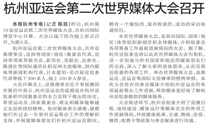 昨日,杭州第19届亚运会第二次世界媒体大会,在杭州国际博览中心开幕。大会以线下结合线上形式召开,为期2天。(今日《郑州日报》4版)