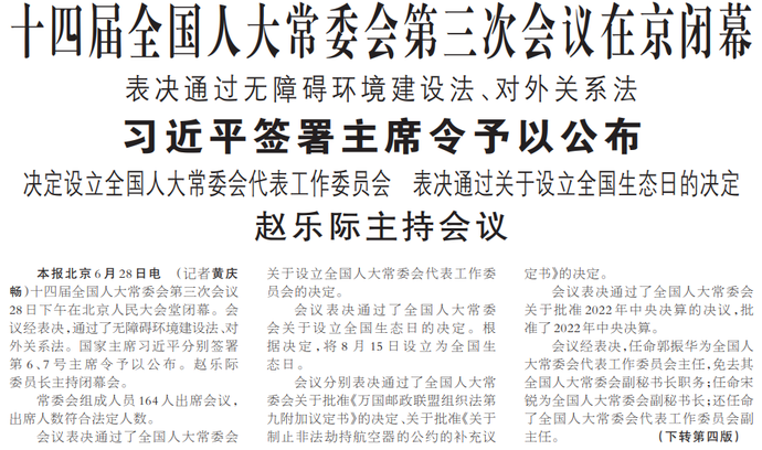 十四届全国人大常委会第三次会议28日下午在北京人民大会堂闭幕。会议经表决,通过了无障碍环境建设法、对外关系法。国家主席习近平分别签署第6、7号主席令予以公布。赵乐际委员长主持闭幕会。(今日《人民日报》1版、4版)