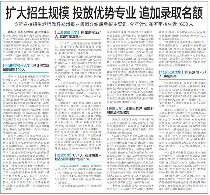 6月28日,中国科学技术大学、上海交通大学、天津大学、武汉大学、北京交通大学5所高校的河南招生组老师,携各校最新招生资讯做客郑州报业集团直播间,为广大河南高考学子科学选报志愿支招。 扩大招生规模、投放优势专业、追加录取名额……今年计划在河南招生近1600人。交流互动中,利好消息一波接一波。(今日《郑州日报》6版)
