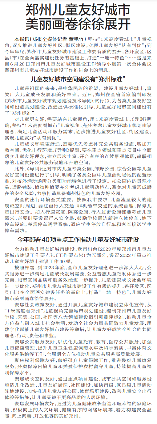 坚持“1米高度看城市”儿童视角,逐步推进儿童友好社区、街区建设,实现儿童友好“从有到优”;到今年年底,郑州市儿童友好城市建设工作要有质的提升,各开发区、区县(市)在全面落实建设任务的基础上,打造“一地一特色”……这是来自6月28日郑州市儿童友好城市建设工作领导小组第一次全体会议暨郑州市儿童友好城市建设工作推进会上的消息。(今日《郑州日报》6版)
