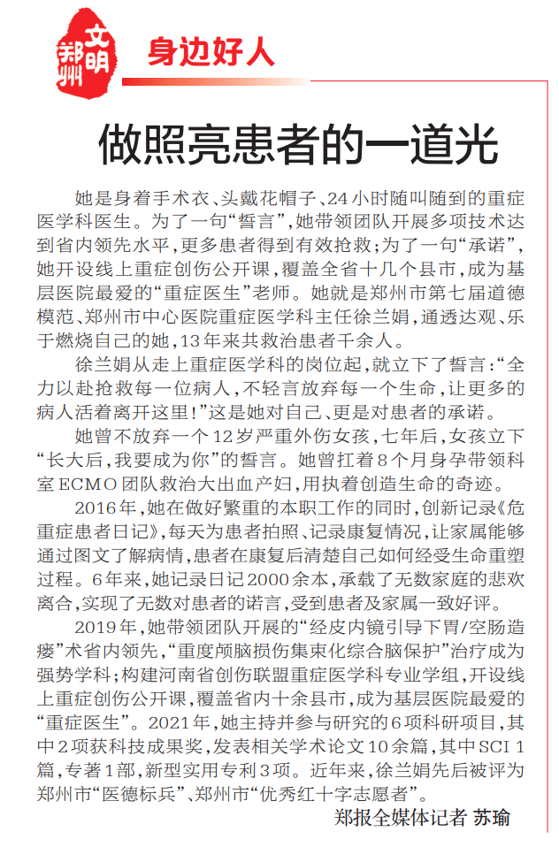 她是身着手术衣、头戴花帽子、24小时随叫随到的重症医学科医生。为了一句“誓言”,她带领团队开展多项技术达到省内领先水平,更多患者得到有效抢救;为了一句“承诺”,她开设线上重症创伤公开课,覆盖全省十几个县市,成为基层医院最爱的“重症医生”老师。她就是郑州市第七届道德模范、郑州市中心医院重症医学科主任徐兰娟,通透达观、乐于燃烧自己的她,13年来共救治患者千余人。(今日《郑州日报》6版)