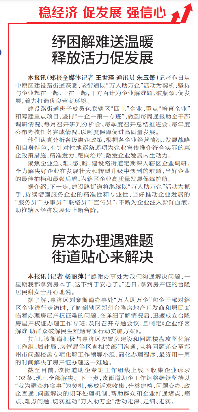 记者昨日从中原区建设路街道获悉,该街道以“万人助万企”活动为契机,坚持与企业想在一起、干在一起,千方百计为企业解难题、破瓶颈、促发展,着力打造优良营商环境。(今日《郑州日报》6版)