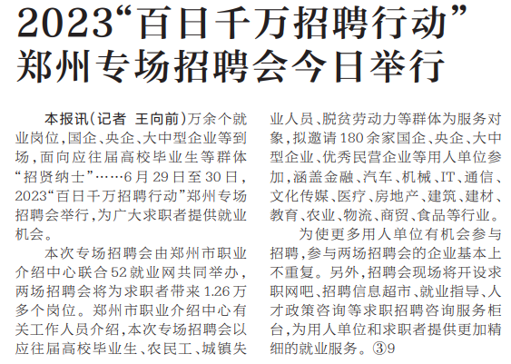 万余个就业岗位,国企、央企、大中型企业等到场,面向应往届高校毕业生等群体“招贤纳士”……6月29日至30日,2023“百日千万招聘行动”郑州专场招聘会举行,为广大求职者提供就业机会。(今日《河南日报》3版)