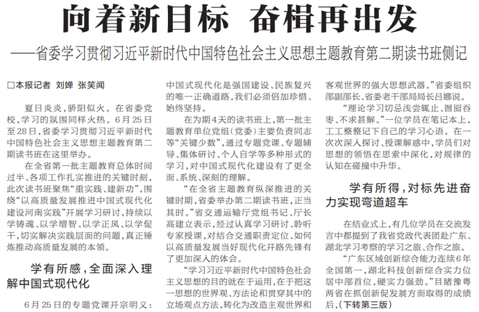 在全省第一批主题教育总体时间过半、各项工作扎实推进的关键时刻,此次读书班聚焦“重实践、建新功”,围绕“以高质量发展推进中国式现代化建设河南实践”开展学习研讨,持续以学铸魂、以学增智、以学正风、以学促干,切实解决实践层面的问题,真正锤炼推动高质量发展的本领。(今日《河南日报》1版、3版)