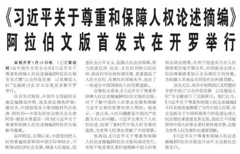 由中国外文局主办的《习近平关于尊重和保障人权论述摘编》阿拉伯文版首发式暨“以合作促发展 以发展促人权”交流研讨会27日在埃及首都开罗举行。(今日《人民日报》1版)