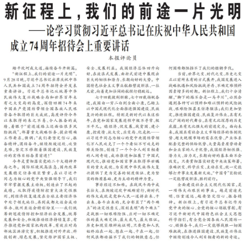 “新征程上,我们的前途一片光明”,9月28日晚,习近平总书记出席庆祝中华人民共和国成立74周年招待会并发表重要讲话。习近平总书记从统筹中华民族伟大复兴战略全局和世界百年未有之大变局的高度,深情回顾74年来中国共产党团结带领全国各族人民艰苦奋斗取得的巨大成就,高度评价今年以来取得的来之不易、令人振奋的成绩,着眼于“前进道路上还面临很多风险挑战”,部署重大战略任务、提出明确工作要求,强调:“我们要坚定信心,振奋精神,团结奋斗,继续爬坡过坎、攻坚克难,坚定不移朝着强国建设、民族复兴的宏伟目标奋勇前进!”(今日《人民日报》1版)