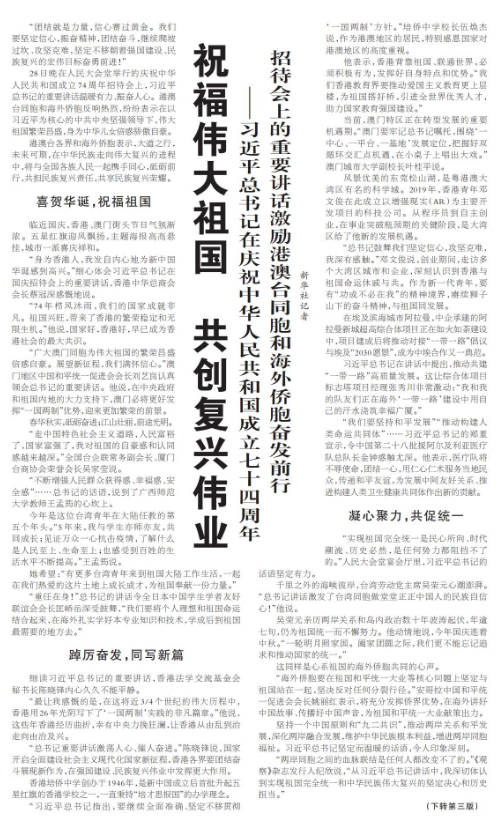 28日晚在人民大会堂举行的庆祝中华人民共和国成立74周年招待会上,习近平总书记的重要讲话温暖有力、振奋人心。(今日《人民日报》2版、3版)