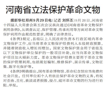 9月28日,河南省十四届人大常委会第五次会议表决通过《河南省革命文物保护利用条例》,从调查认定、保护管理、传承利用等方面对革命文物保护利用作出规范性要求,明确了法律责任。(今日《郑州日报》1版)