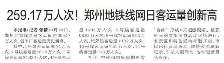 9月28日,郑州地铁线网日客运量达259.17万人次,创单日客运量历史新高。(今日《郑州日报》1版)