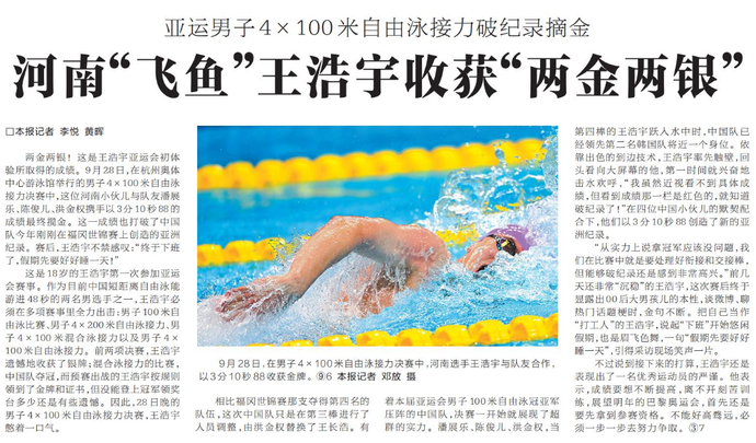 两金两银!这是王浩宇亚运会初体验所取得的成绩。9月28日,在杭州奥体中心游泳馆举行的男子4×100米自由泳接力决赛中,这位河南小伙儿与队友潘展乐、陈俊儿、洪金权携手以3分10秒88的成绩最终揽金。这一成绩也打破了中国队今年刚刚在福冈世锦赛上创造的亚洲纪录。赛后,王浩宇不禁感叹:“终于下班了,假期先要好好睡一天!”(今日《河南日报》3版)