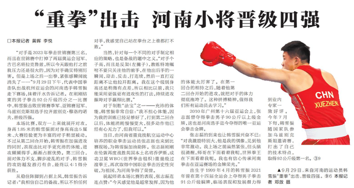 “对手是2023年拳击世锦赛第三名,而且在世锦赛中打掉了两届奥运会冠军、古巴名将拉克鲁兹,所以今天跟他打之前我压力还是很大的,因为对手确实特别厉害。但是上场之后一出拳,紧张感瞬间就消失了……”9月29日下午,代表中国拳击队出战杭州亚运会的河南选手韩雪振走下赛场,抹着汗水告诉记者。在刚刚结束的男子拳击92公斤级四分之一比赛中,韩雪振击败世锦赛季军、亚锦赛冠军、乌兹别克斯坦选手拉齐兹别克·穆洛约诺夫,晋级四强。(今日《河南日报》3版)