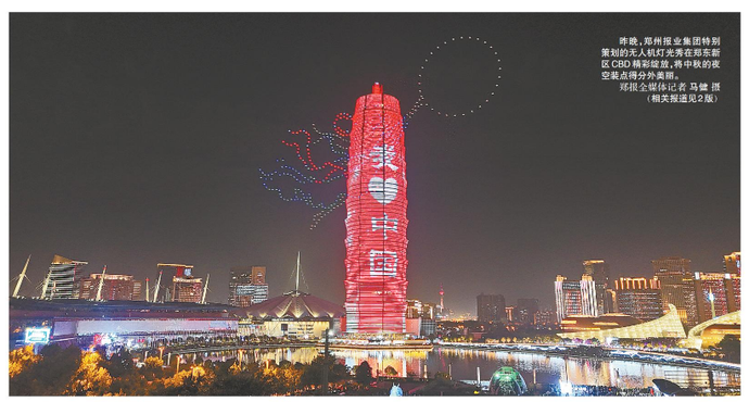 昨晚,郑州报业集团特别策划的无人机灯光秀在郑东新区CBD精彩绽放,将中秋的夜空装点得分外美丽。(今日《郑州日报》1版)