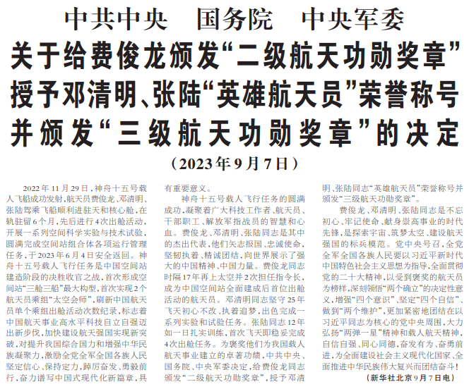 授予邓清明、张陆“英雄航天员”荣誉称号