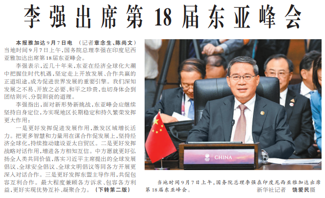 当地时间9月7日上午,国务院总理李强在印度尼西亚雅加达出席第18届东亚峰会。(今日《人民日报》1版、2版)