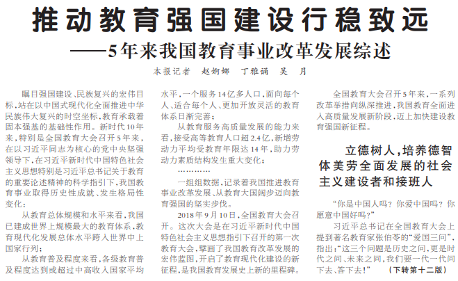 瞩目强国建设、民族复兴的宏伟目标,站在以中国式现代化全面推进中华民族伟大复兴的时空坐标,教育承载着固本强基的基础性作用。新时代10年来,特别是全国教育大会召开5年来,在以习近平同志为核心的党中央坚强领导下,在习近平新时代中国特色社会主义思想特别是习近平总书记关于教育的重要论述精神的科学指引下,我国教育事业取得历史性成就、发生格局性变化。(今日《人民日报》1版、12版)